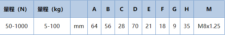 量程:50N(5kg)、100N(10kg)、200N(20kg)、500N(50kg)、1000N(100kg)