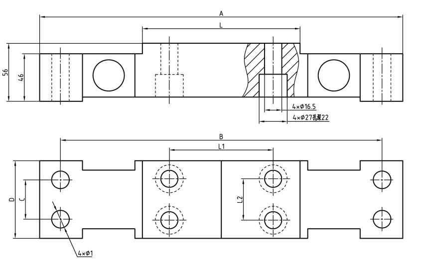 型號 | 量程(kN) | 量程(t) | A | B | C | D | L | L1 | L2 | Φ1 |