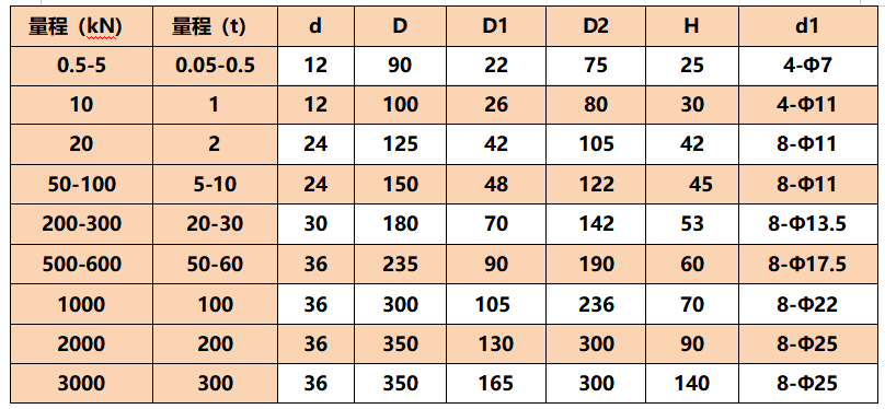 量程: 0.5kN(0.05t)、1kN(0.1t)、2 kN(0.2t)、5 kN(0.5t)、10 kN(1t)、20 kN(2t)、50 kN(50t)、100 kN(10t)、200 kN(20t)、300 kN(30t)、500 kN(50t)、600 kN(60t)、 1000 kN(100t)、2000 kN(200t)、3000kN (300t)