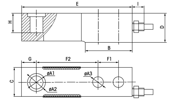 型號 | 量程(kN) | 量程(t) | ΦA1 | ΦA2 | ΦA3 | B | C | D | E | F1 | F2 | G | H | I | J |